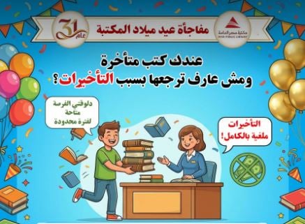 تطلق مكتبة مصر العامة الرئيسية، بمناسبة مرور 31 عامًا على تأسيسها، مبادرة خاصة خلال الفترة من 20 إلى 30 أبريل، تهدف إلى إعادة الكتب المتأخرة؛ لزيادة تداول المعرفة وإتاحة ...